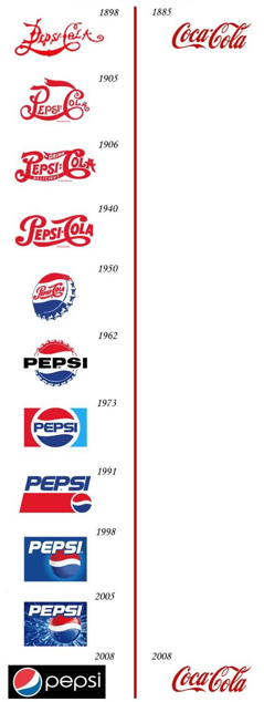 The time line is funny and memorable indeed, and strengthens the already strong image of Coca Cola's triumphing victory over Pepsi throughout years whereas Pepsi struggles with new brand images decade after decade. And it's true that the best designs last unaffected by time. Coca Cola's hasn't, though.